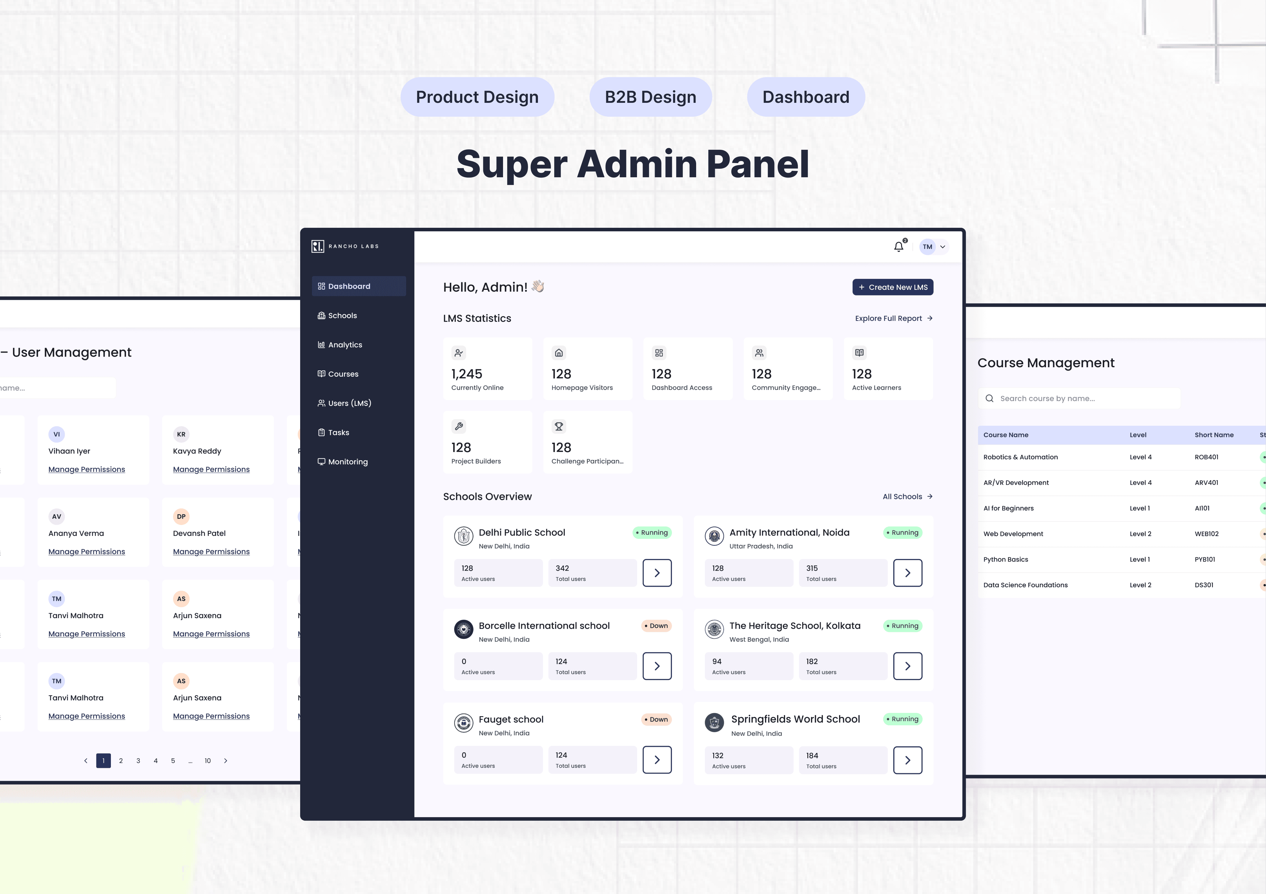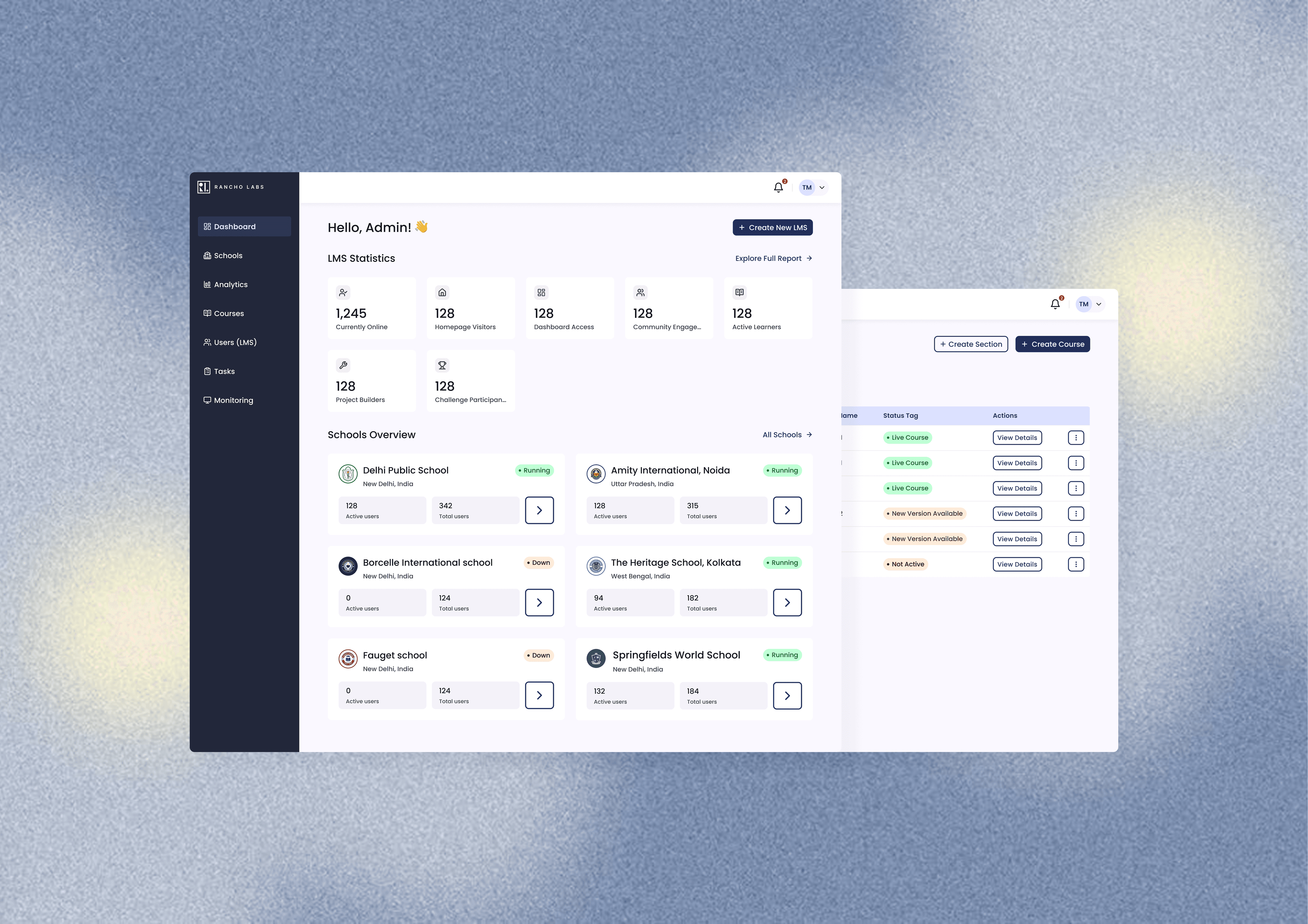 Simplified school onboarding at Rancho Labs from manual processes to centralized dashboard. ~90% faster setup time. Enabled faster scaling.