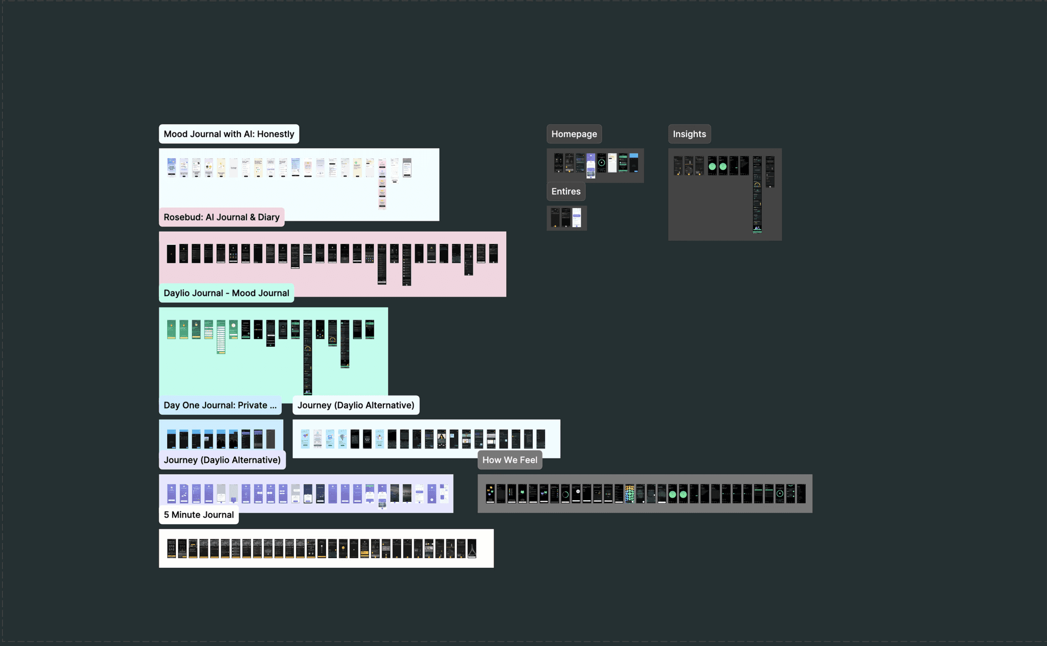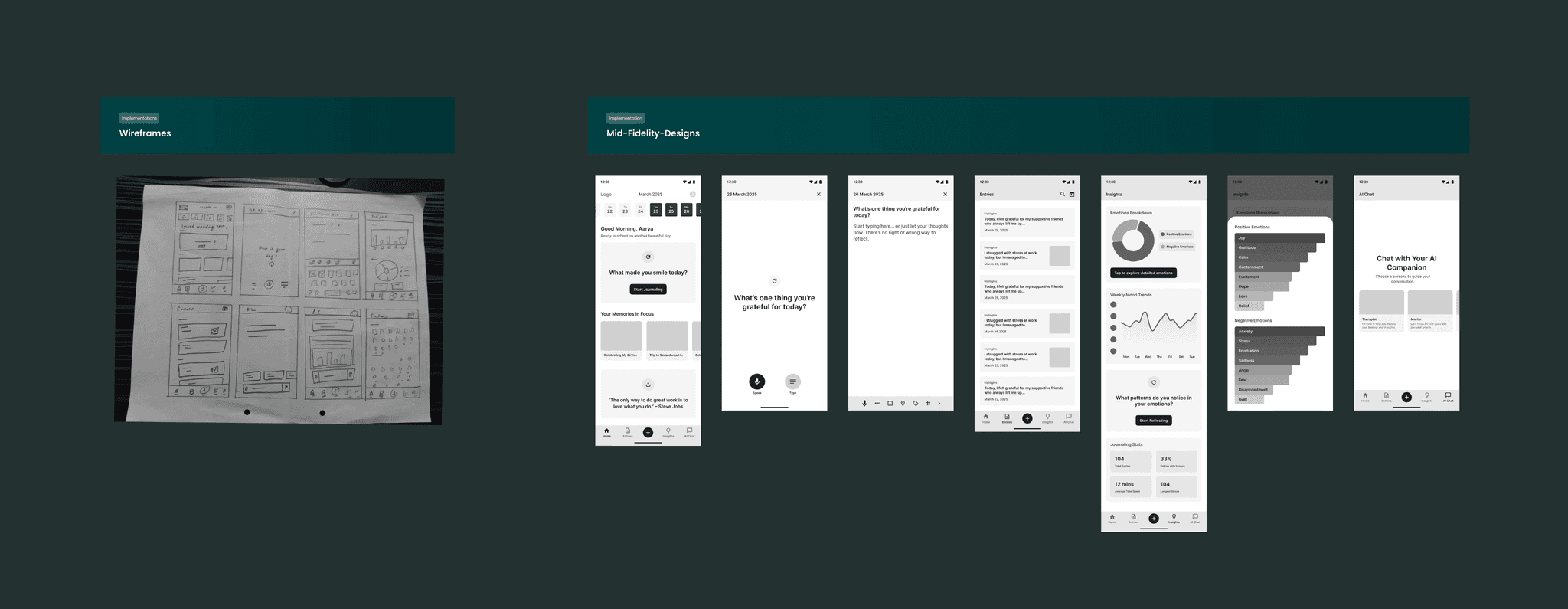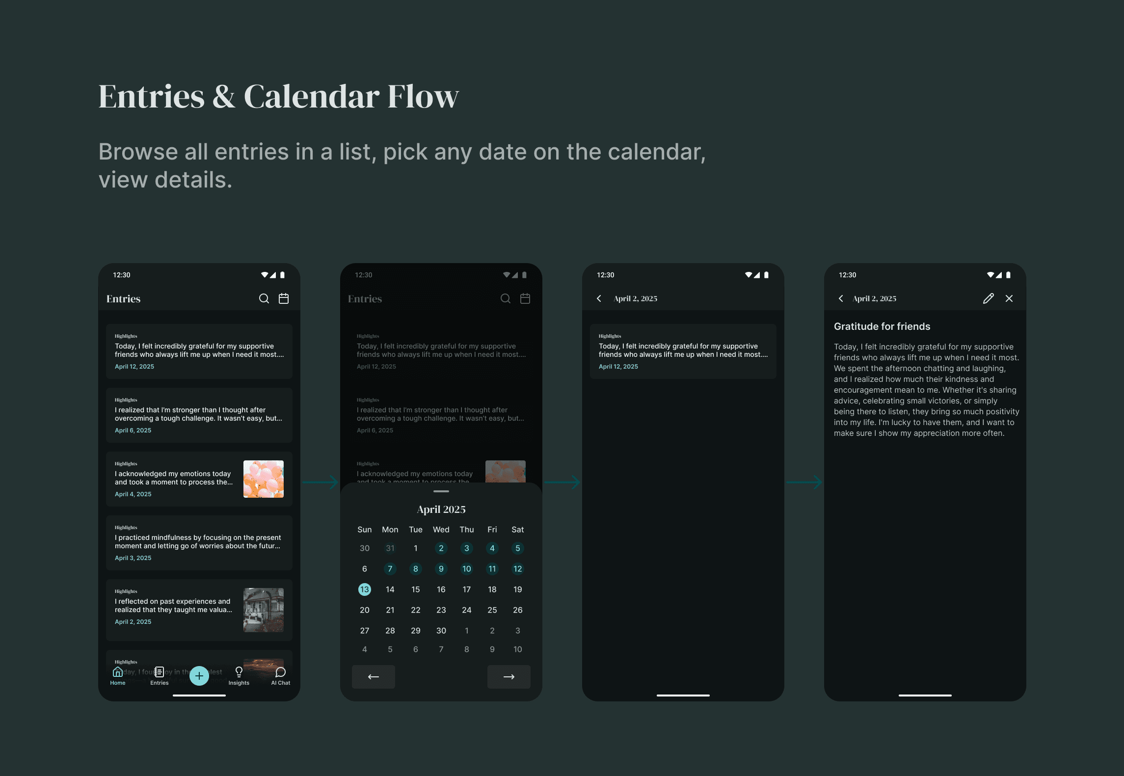 I designed screens for homepage, entries list with calendar, search, new journal entry options, insights dashboard, and AI chat. I made quick iterations to focus on core experience over perfection.