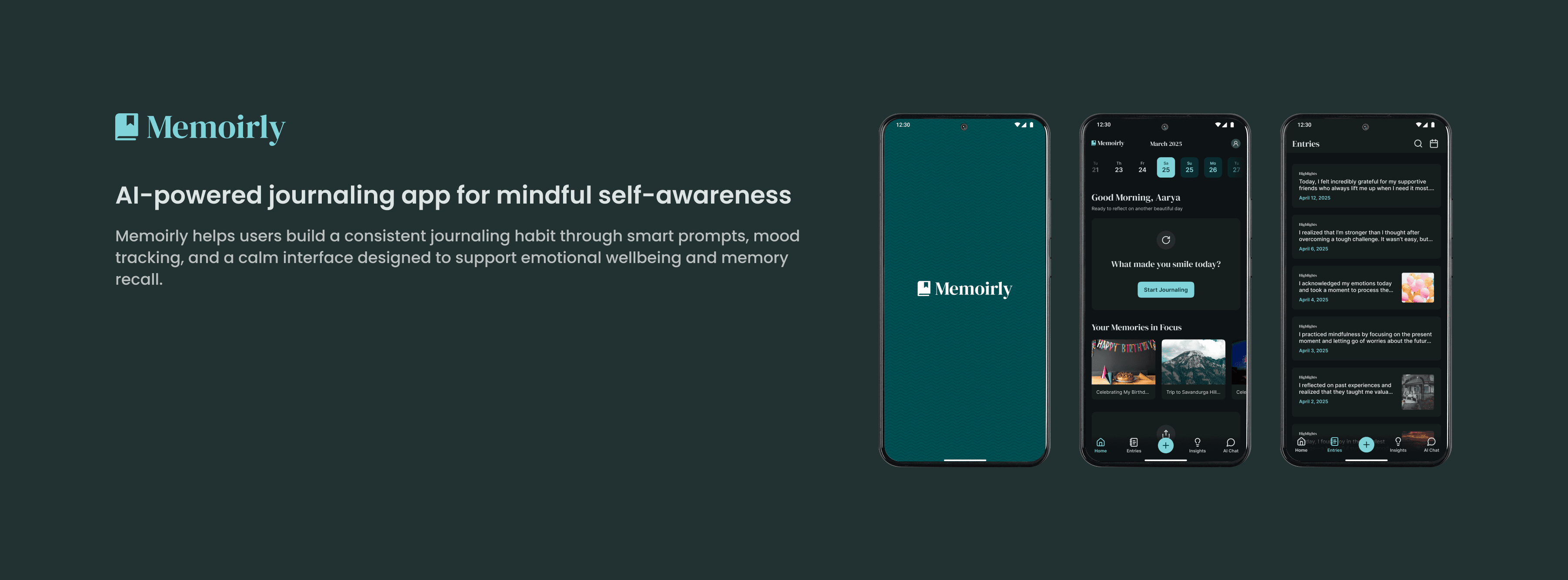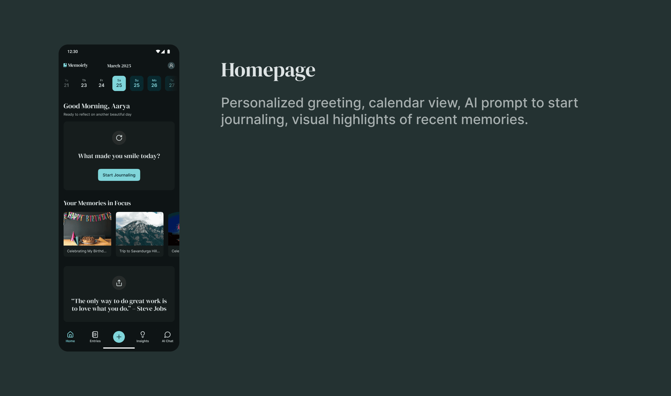 A journaling app designed to help users document their thoughts, memories, and experiences, and generate insights from AI. Focused on mindfulness, self-reflection, and personal growth.