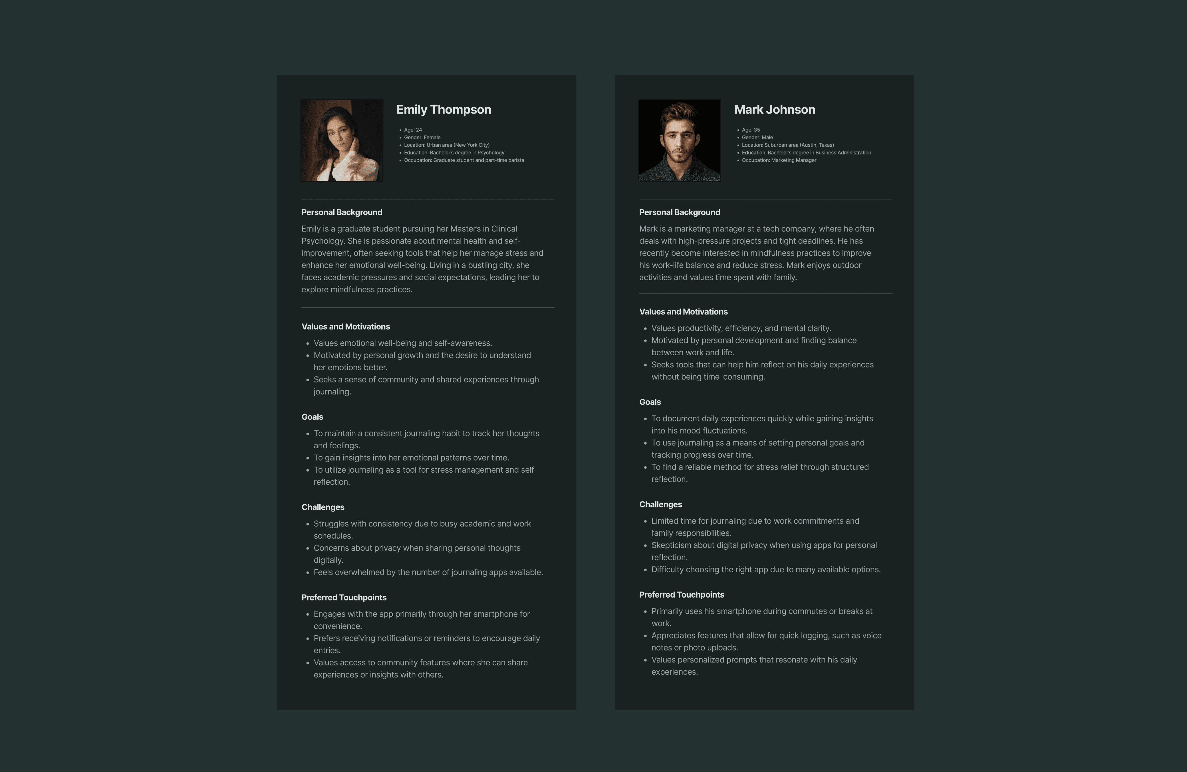 I created two main personas, Emily, a student who wants quick journaling but worries about privacy, and Mark, a busy parent who needs real value. These helped me stay focused on actual user needs.