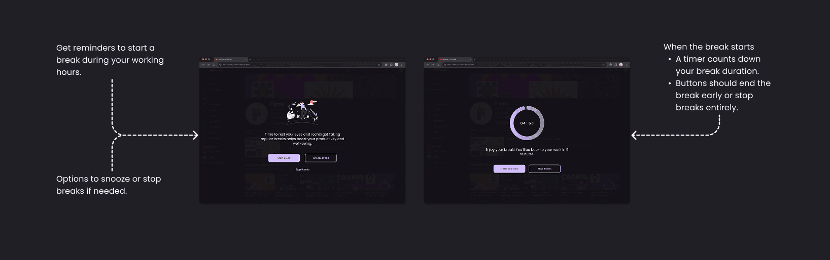 • Simplified into a single extension screen showing key stats (screen time, break status, and start/stop buttons).